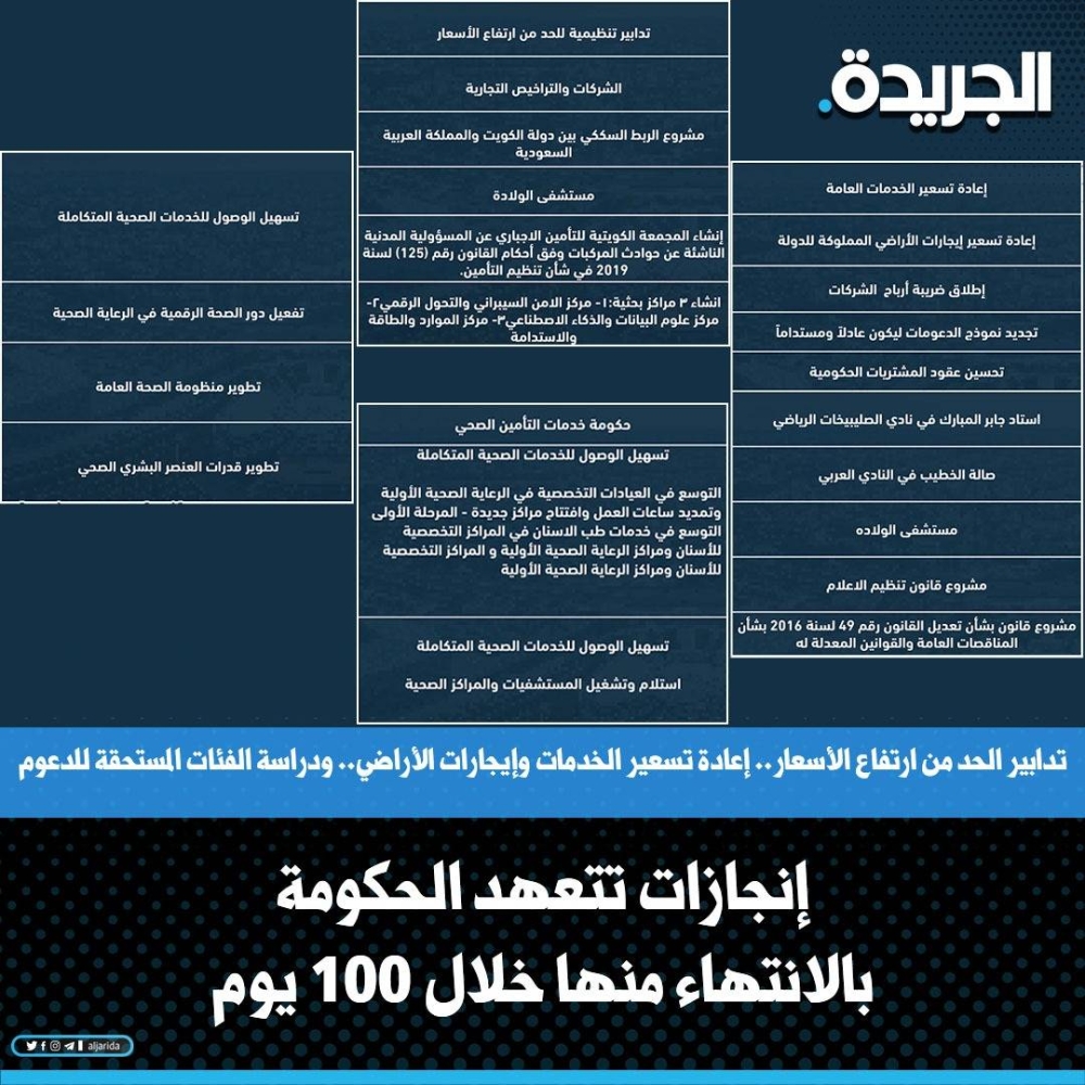 تعهدت الحكومة، ومن خلال برنامج عملها الذي تقدمت به إلى مجلس الأمة، اليوم الثلاثاء، بتحقيق إنجازات في عدد الملفات خلال 100 يوم.
