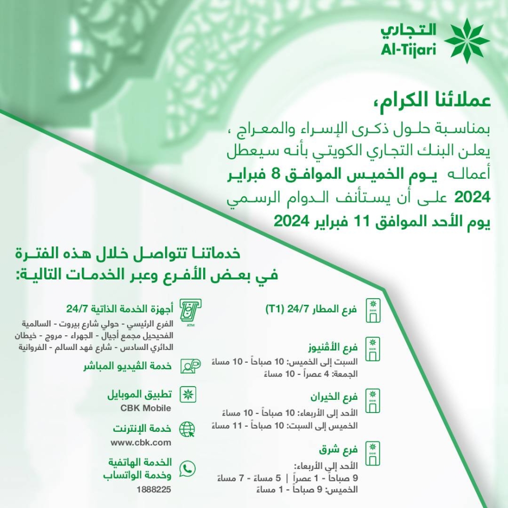 أعلن البنك التجاري الكويتي استمرار تقديم خدماته المصرفية للعملاء خلال عطلة الإسراء والمعراج غدا الخميس، في فرع مطار الكويت الدولي T1 (قاعة الوصول) على مدار الساعة، إضافة إلى فرع الأفنيوز، من 10:00 صباحا إلى 10:00 مساء طوال فترة العطلة، ويوم الجمعة من 4:00 عصراً إلى 10:00 مساء، فرع الخيران من 10:00 صباحاً إلى 11:00 مساءً من الخميس إلى السبت، وفرع شرق من 9:00 صباحاً إلى 1:00 ظهراً من الخميس إلى السبت.