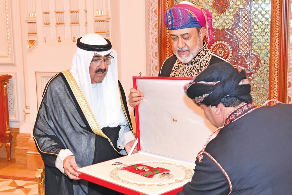 تبادل صاحب السمو أمير البلاد الشيخ مشعل الأحمد وسلطان عمان هيثم بن طارق، بقصر العلم مساء أمس، الأوسمة، حيث قلد السلطان هيثم سمو الأمير وسام «آل سعيد»، الذي يعد من أرفع الأوسمة العمانية، تقديرا منه لصاحب السمو، واعتزازا بعمق أواصر الأخوة والصداقة المتينة التي تجمع البلدين والشعبين الشقيقين.