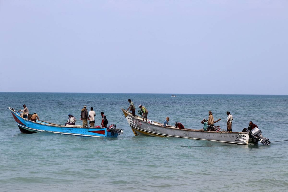 صيادون يمنيون عائدون من رحلة الصيد في منطقة الخوخة على الطرف الجنوبي لمدينة الحديدة على البحر الأحمر