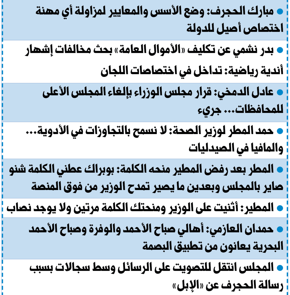 وفي هذه الأثناء ترأس نائب رئيس مجلس الأمة محمد المطير الجلسة، وقال النائب عادل الدمخي، إن قرار مجلس الوزراء أمس بإلغاء المجلس الأعلى للمحافظات قرار جريء نثني عليه، فهذا كان مجلس للبطالة المقنعة، كذلك هناك تكدس كبير للموظفين في وزارات الدولة، وإذا كانت هناك إدارة ناجحة للاستفادة من التكدس، فسوف يدرّ على الدولة موارد كبيرة.
