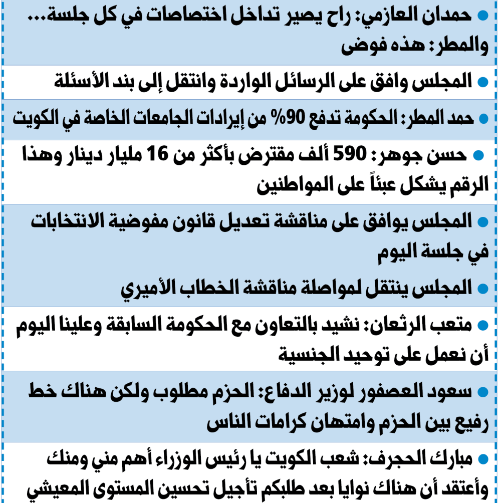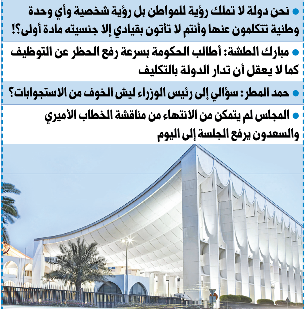 بعدها، قال رئيس الجلسة محمد المطير: لدي طلب بفتح باب ما يستجد من أعمال، وطلب نيابي آخر بشأن تقرير «التشريعية» حول تعديل قانون مفوضية الانتخابات على جلسة اليوم الأربعاء، ووافق المجلس على ذلك، وانتقل إلى مواصلة مناقشة الخطاب الأميري.