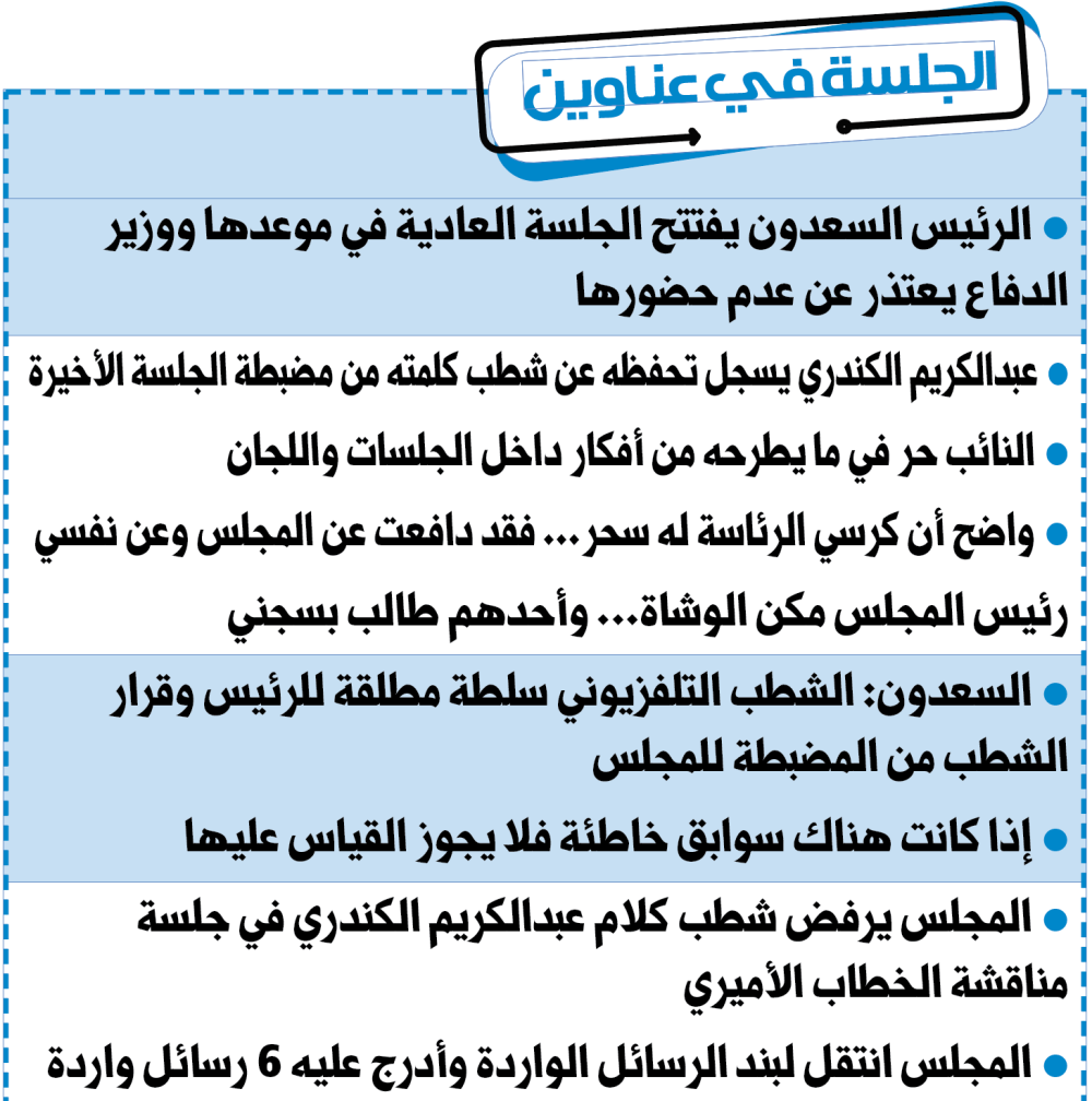 وعقّب السعدون على الكندري قائلاً: فيما يتعلق بالشطب التلفزيوني هي سلطة مطلقة للرئيس، وقرار الشطب من المضبطة للمجلس، وإن كانت هناك سوابق خاطئة فلا يجوز. وفي هذا الصدد رفض المجلس شطب كلام عبدالكريم الكندري من المضبطة للجلسة الماضية.
