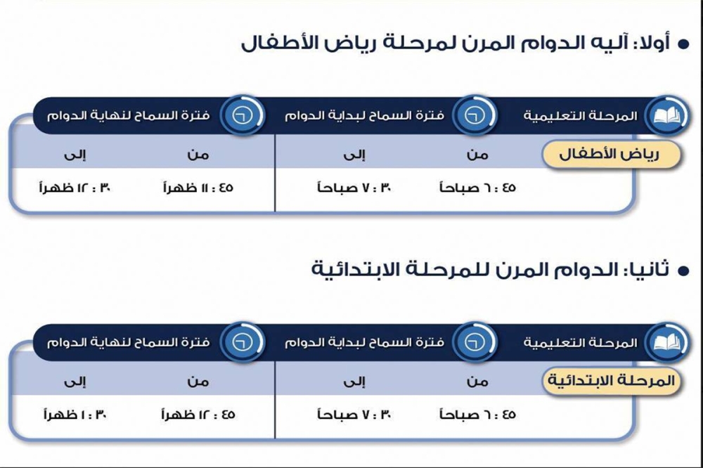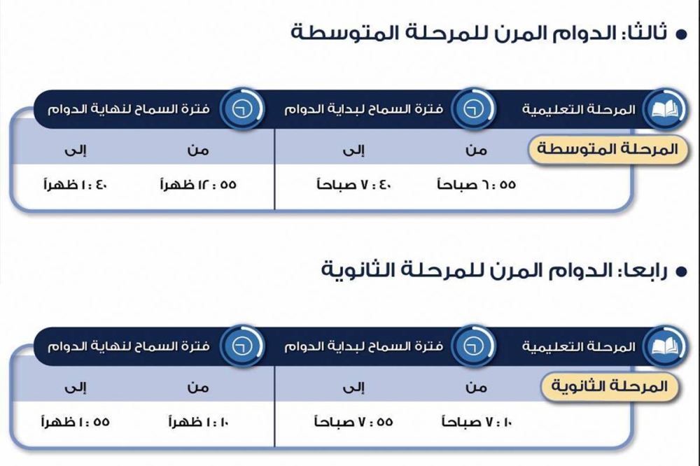 • المرونة بناءً على الجداول اليومية مع الالتزام بالحصص الدراسية