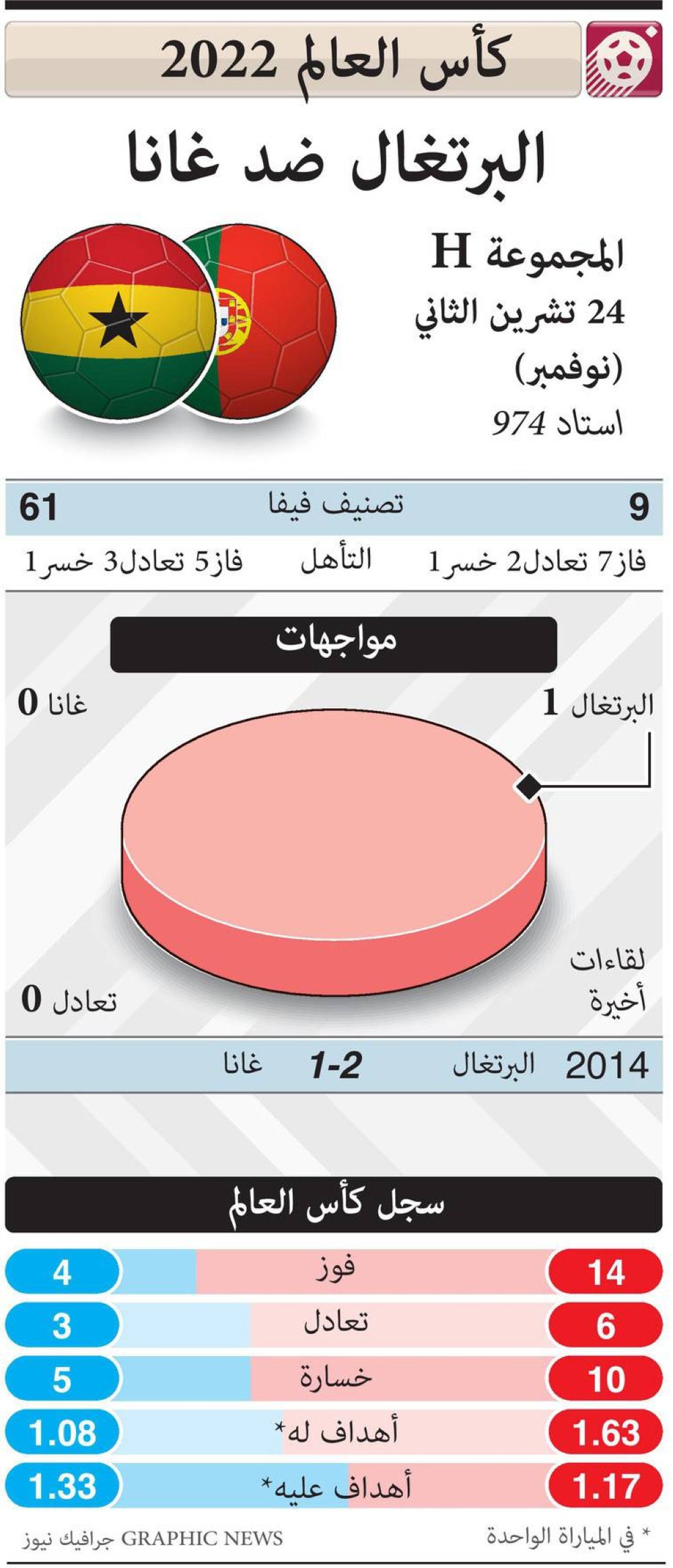 يستهل منتخب البرتغال مشواره في المونديال اليوم بلقاء نظيره منتخب غانا ضمن الجولة الاولى من المجموعة الثامنة في الدور الاول «المجموعات».