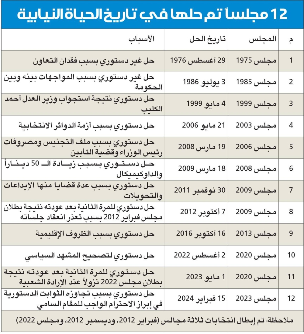 وتنص المادة 107 من الدستور على أن «للأمير أن يحل مجلس الأمة بمرسوم تبين فيه أسباب الحل على أنه لا يجوز حل المجلس لذات الأسباب مرة أخرى، وإذا حل المجلس وجب إجراء الانتخابات للمجلس الجديد في ميعاد لا يجاوز شهرين من تاريخ الحل، فإن لم تجرَ الانتخابات خلال تلك المدة يسترد المجلس المنحل كامل سلطته الدستورية ويجتمع فوراً كأن الحل لم يكن، ويستمر في أعماله إلى أن ينتخب المجلس الجديد».