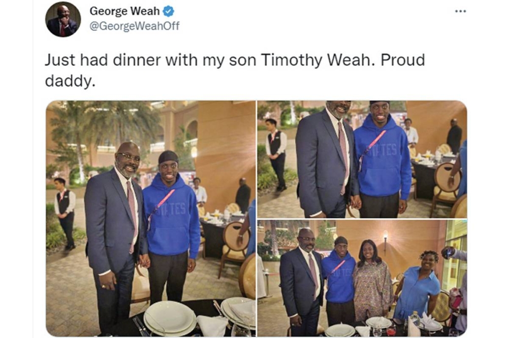ونشر الرئيس الليبيري ونجم كرة القدم السابق جورج وياه صورا تجمعه بنجله تيموثي خلال عشاء جمعهما أمس ، وكتب تعليقا «والد فخور».