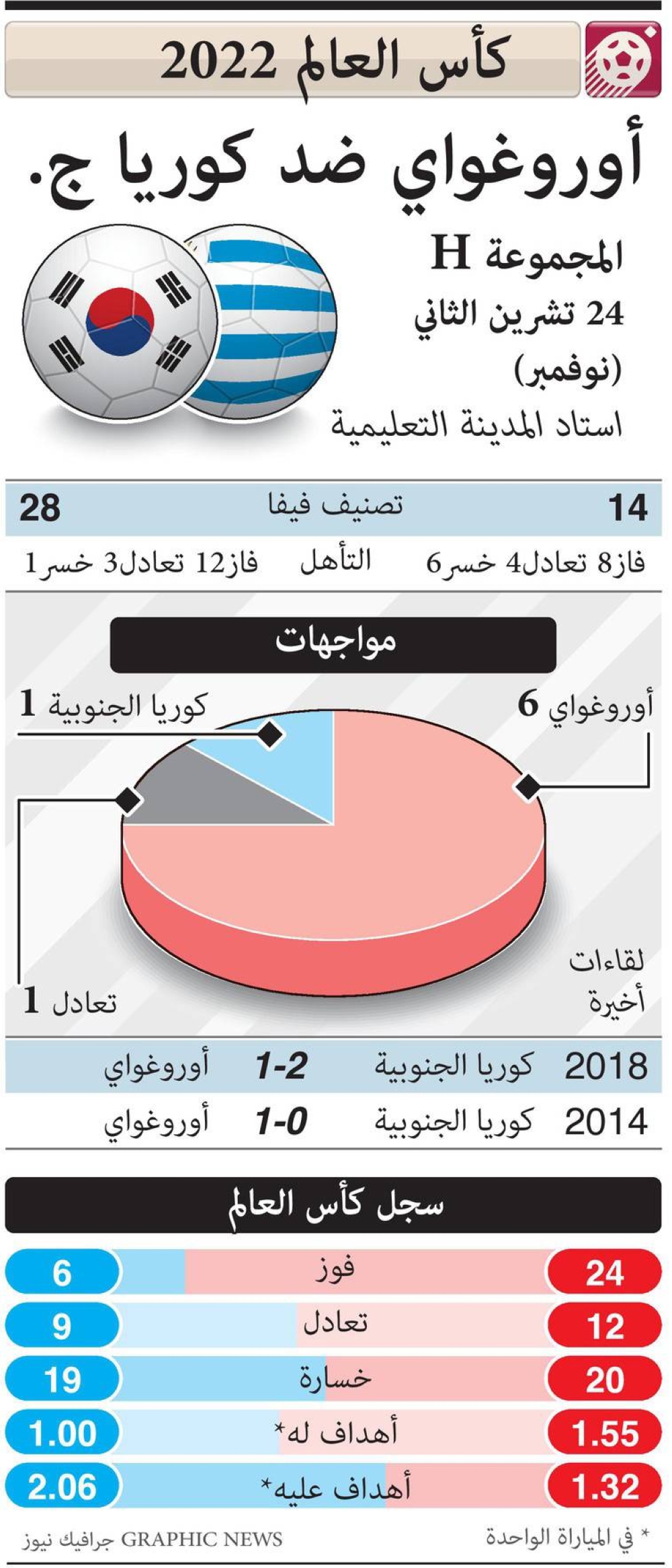 يلتقي منتخب الأوروغواي، بطل العالم 1930 و1950، اليوم، منتخب كوريا الجنوبية ضمن المجموعة الثامنة من الدور الأول في مونديال قطر لكرة القدم 2022.