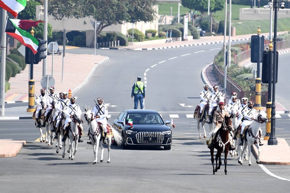 وعند الوصول إلى منصة الشرف تم عزف السلام الوطني لدولة الكويت، والسلام الوطني لدولة قطر.