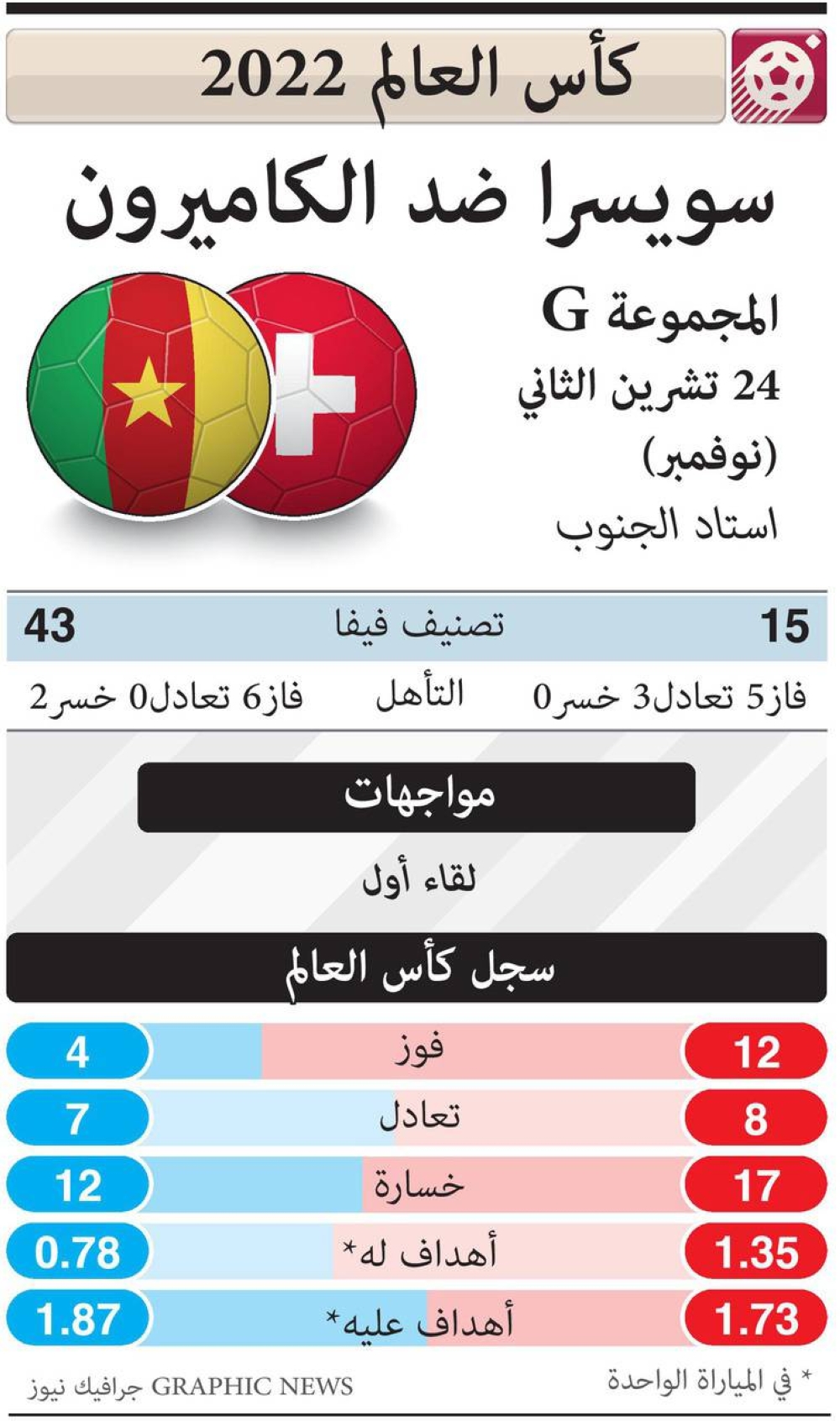 لم يسبق للمنتخبين الكاميروني والسويسري أن تواجها من قبل؛ سواء رسميا أو ودّيا، وهو ما يجعل المواجهة المقررة بينهما عند الواحدة ظهر اليوم على استاد الجنوب في الجولة الأولى من منافسات المجموعة السابعة، استثنائية وغامضة، وسط تطلعات من المنتخبين لوضع قدم في الدور الثاني، قبل مواجهتَي صربيا والبرازيل.