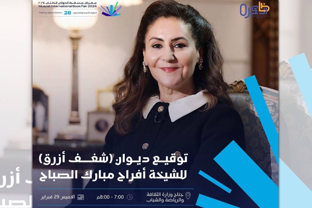 ضمن فعاليات معرض مسقط الدولي للكتاب، توقِّع مساء اليوم الشاعرة الكويتية الشيخة أفراح مبارك الصباح ديوانها الشعري «شغف أزرق»، في جناح وزارة الثقافة والرياضة والشباب في السابعة مساءً.