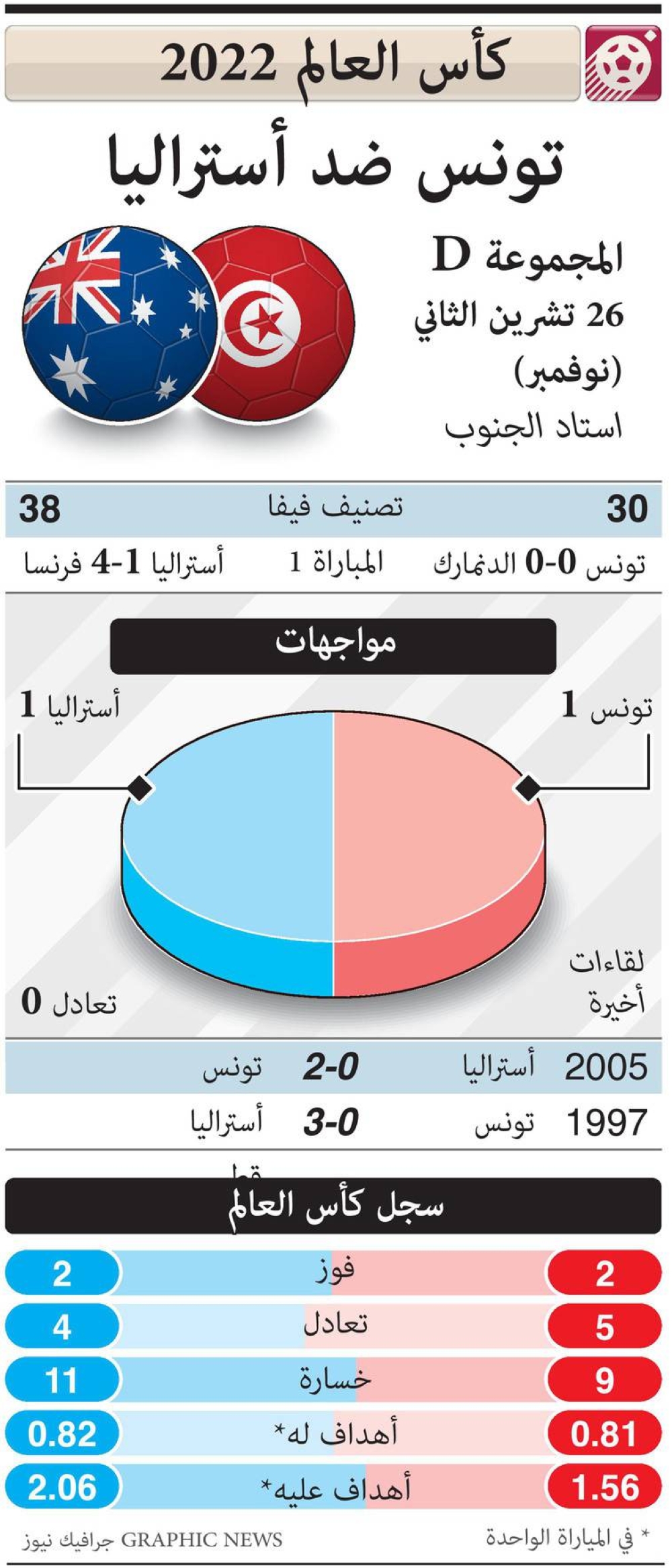 وفي مباراة أخرى، ضمن نفس المجموعة، سيحاول المنتخب التونسي تحقيق الفوز على أستراليا المهزوزة، وقد أثبت «نسور قرطاج» في المباراة الأولى أنهم على مستوى عالٍ، لكنهم أضاعوا العديد من الفرص. ويعتمد جلال القادري، مدرب تونس، على ثنائي الدوري الفرنسي، منتصر الطالبي (لوريان)، وعلي العابدي (كان)، إلى جانب نجم الفريق المهاجم وهبي الخزري، الذي جلس على مقاعد الاحتياط في مواجهة الدنمارك، كما سيكون ياسين الخنيسي، الذي يمتاز بالسرعة، على موعد لإثبات إمكانياته.