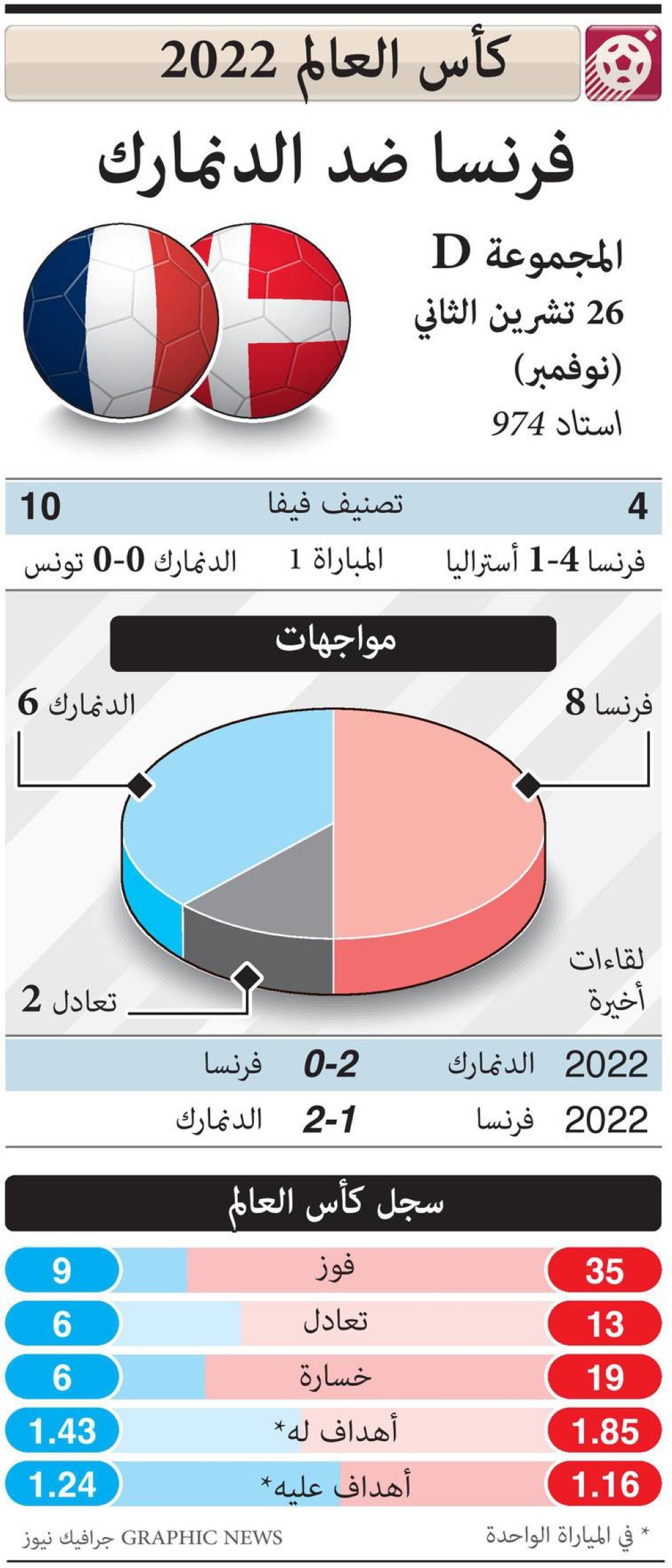 في المقابل، يعوِّل المنتخب الدنماركي، بقيادة المدرب كاسبر هيولماند، على نجم الفريق كريستيان إريكسن، العائد إلى الملاعب بعد أزمة قلبية كادت تودي بحياته، إلى جانب حارس المرمى المتألق كاسبر شمايكل. ورغم أنه لم يقدم المستوى المتوقع في المواجهة الأولى أمام تونس، فإن المنتخب الدنماركي يملك العناصر التي بإمكانها قلب الموازين وتشكيل صعوبة على نظيره الفرنسي في مواجهة السبت.