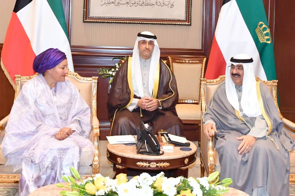 استقبل صاحب السمو أمير البلاد الشيخ مشعل الأحمد، بقصر بيان صباح اليوم، نائبة الأمين العام للأمم المتحدة أمينة محمد والوفد المرافق، وذلك بمناسبة زيارتها للبلاد. وحضر اللقاء كبار المسؤولين بالدولة.