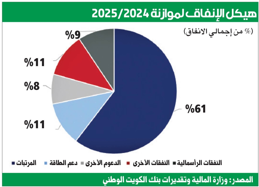 وقال «الوطني» في تقرير صدر أمس، إنه من المقرر أن يبلغ بند النفقات 24.6 مليار دينار في السنة المالية 2024/2025، بانخفاض نسبته 6.6 في المئة مقارنة بموازنة العام السابق. كما تم خفض النفقات على جميع البنود الرئيسية: الدعوم (-22 في المئة مقارنة بالموازنة السابقة، لنحو 4.7 مليارات دينار)، والرواتب (-0.8 في المئة إلى 14.8 مليار دينار)، والنفقات الرأسمالية (-7.7 في المئة إلى 2.3 مليار دينار)، والنفقات الأخرى (-4.7 في المئة إلى 2.7 مليار دينار).