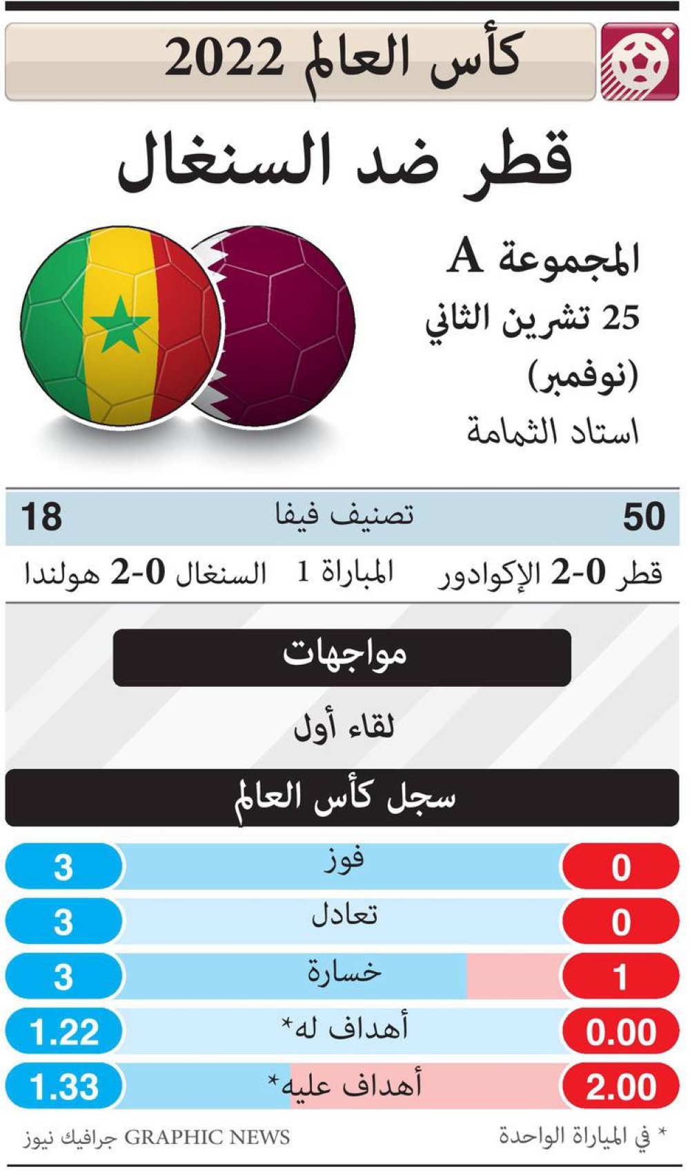 وكان المنتخب القطري (أصحاب الأرض) خسر النزال الافتتاحي أمام المنتخب الإكوادوري (صفر - 2)، الأحد، على ملعب البيت، في سقوط زاد من الضغط على القطريين، بعدما باتوا أول مضيف لكأس العالم يخسر مباراته الأولى.