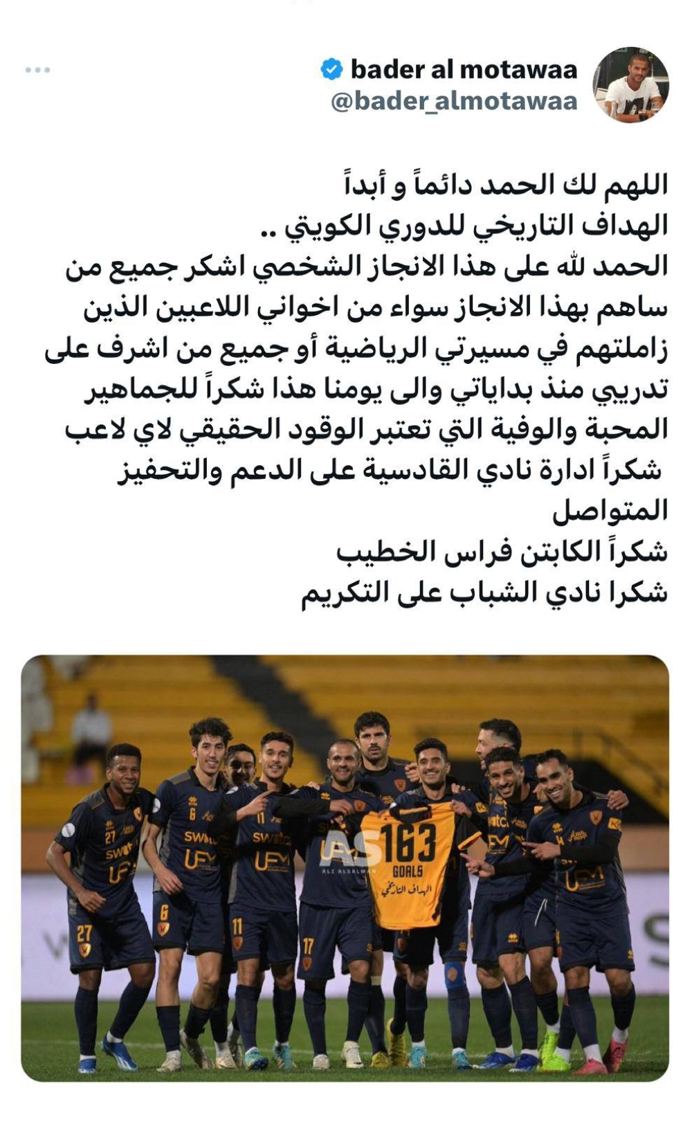 وكانت اللقطة الأبهى في تتويج المطوع هذا الممر الشرفي من لاعبي الشباب في المباراة التي جمعت الفريقين، كما كان احتفال زملائه اللاعبين في القادسية مميزاً، برفع قميص للمطوع يحمل رقم 163.