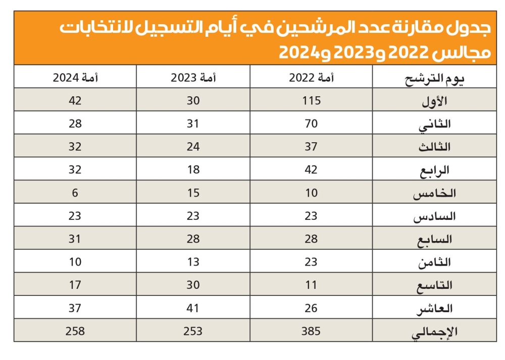 وعلى صعيد تسجيل عدد المرشحين نسبة لأيام فتح باب الترشح، فبلغ عدد المسجلين في اليوم الأول لانتخابات «أمة 2022» 115 مرشحاً، مقابل 30 مرشحاً في «أمة 2023»، و42 للانتخابات الحالية، وفي اليوم الثاني بلغ عدد المرشحين 70 مرشحاً في «أمة 2022»، مقابل 31 في «أمة 2023»، و28 في الانتخابات الحالية، وفي اليوم الثالث سجل 37 في «أمة 2022» مقابل 24 في «أمة 2023»، و32 في الانتخابات الحالية، وفي اليوم الرابع 42 مرشحا في «أمة 2022»، مقابل 18 في «أمة 2023»، و32 في الانتخابات الحالية، وفي اليوم الخامس 10 مرشحين في «أمة 2022»، مقابل 15 في «أمة 2023»، و6 في الانتخابات الحالية.