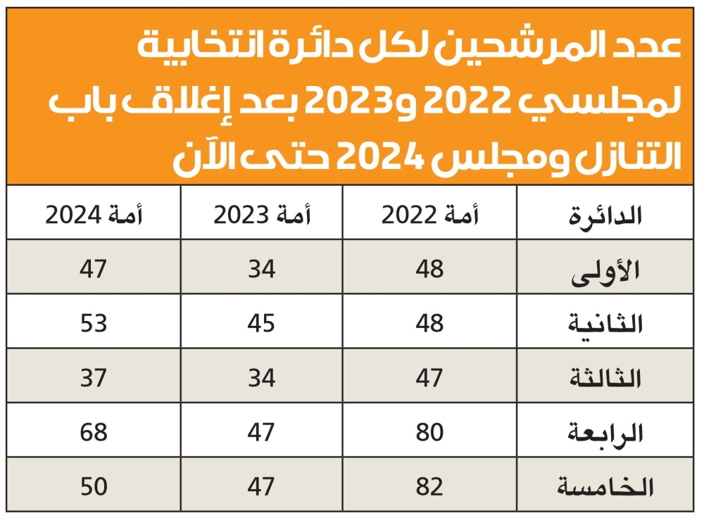 كما بلغ عدد مرشحي الدائرة الثالثة في انتخابات «أمة 2022» 47 مرشحاً، مقابل 34 في «أمة 2023»، و37 في الانتخابات الحالية، وبلغ عدد مرشحي الدائرة الرابعة لانتخابات «أمة 2022» 80 مرشحاً، مقابل 47 لانتخابات «أمة 2023»، و68 في الانتخابات الحالية، وبلغ عدد مرشحي الدائرة الخامسة 82 مرشحاً في انتخابات «أمة 2022»، مقابل 47 في انتخابات «أمة 2023»، و50 في الانتخابات الحالية.