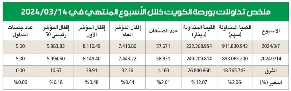 واستمر مؤشر بورصة الكويت العام بصدارة المؤشرات الخليجية لعام 2024 حيث بلغت مكاسبه نسبة 9.4 في المئة بعد أن أضاف الأسبوع الماضي نسبة 0.44 في المئة أي 32.36 نقطة ليقفل على مستوى 7443.22 نقطة، وحقق مؤشر السوق الأول نمواً مقارباً حيث بلغت مكاسبه خلال شهرين ونصف الشهر من هذا العام الى نسبة 9.3 في المئة حيث ربح 0.48 في المئة خلال الأسبوع الماضي والتي تعادل 38.91 نقطة ليقفل على مستوى 8149.40 نقطة، وربح مؤشر رئيسي 50 نسبة 9 في المئة أي بعد أن ربح خلال تعاملات الأسبوع الماضي نسبة 0.18 في المئة أي 10.67 نقطة ليقفل على مستوى 5994.50 نقطة.
