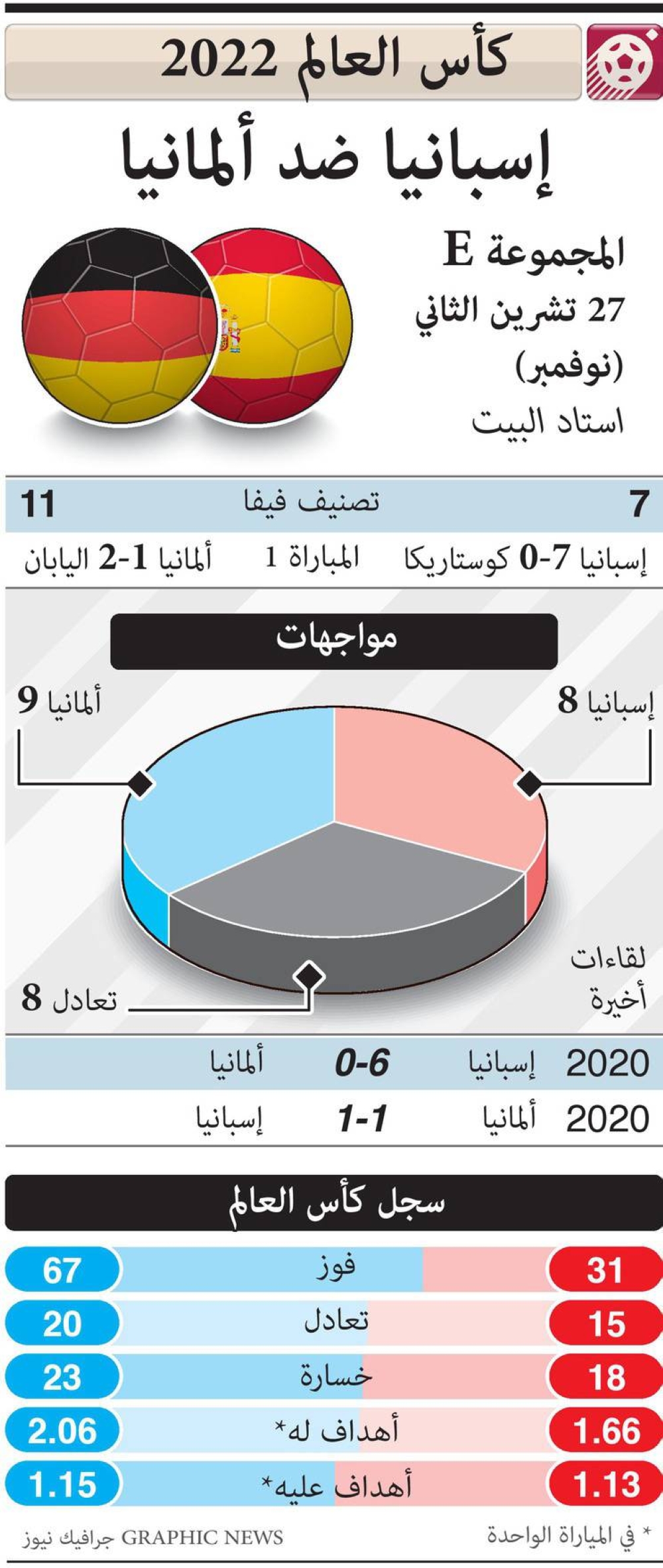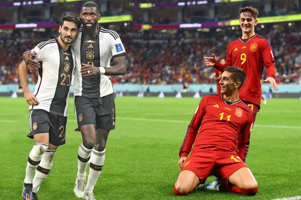 واستهل المنتخبان العرس الكروي بظروف مغايرة، فبينما كانت ألمانيا، حاملة اللقب 4 مرات، تسقط من عليائها بخسارة تاريخية أمام اليابان رغم تقدمها بهدف إيلكاي غوندوغان من ركلة جزاء (1-2)، حققت إسبانيا بعد 3 ساعات فوزا تاريخيا هو الأكبر لها في نهائيات كأس العالم بسباعية نظيفة أمام كوستاريكا.