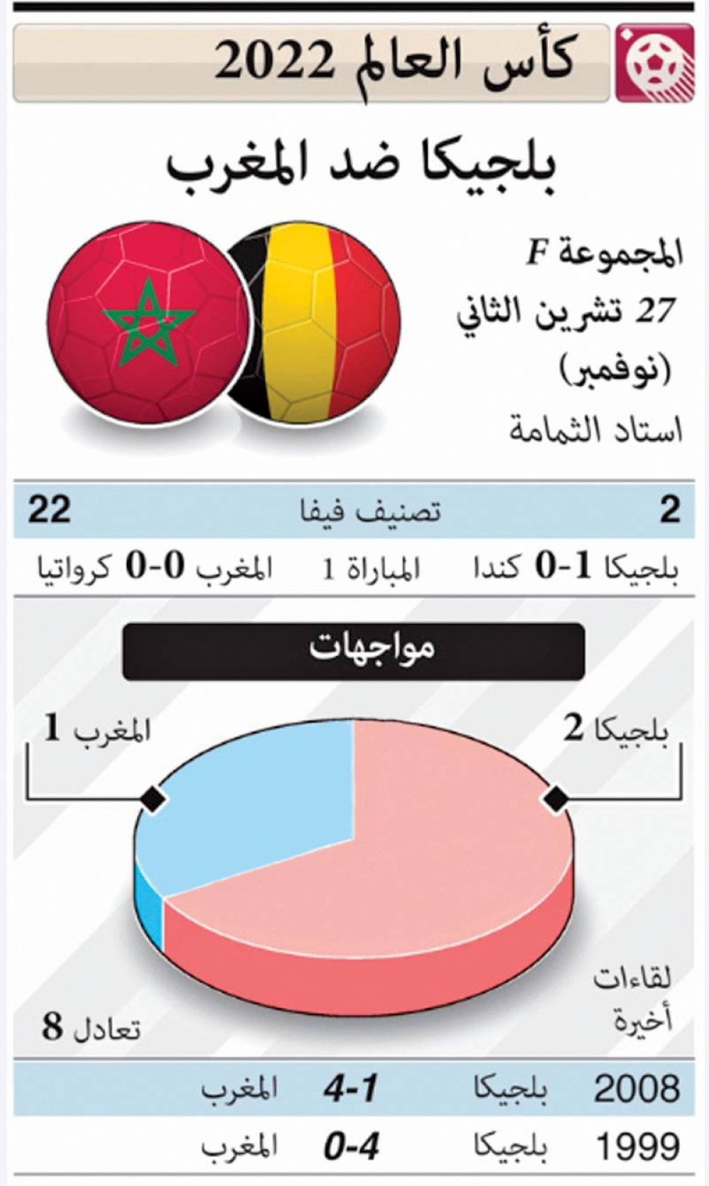 تسعى بلجيكا، ثالثة النسخة الأخيرة، إلى تلميع صورتها، وبلوغ الدور الثاني لنهائيات كأس العالم لكرة القدم في قطر، عندما تلتقي مع المغرب المتعطش إلى الفوز اليوم، في الجولة الثانية من منافسات المجموعة السادسة.