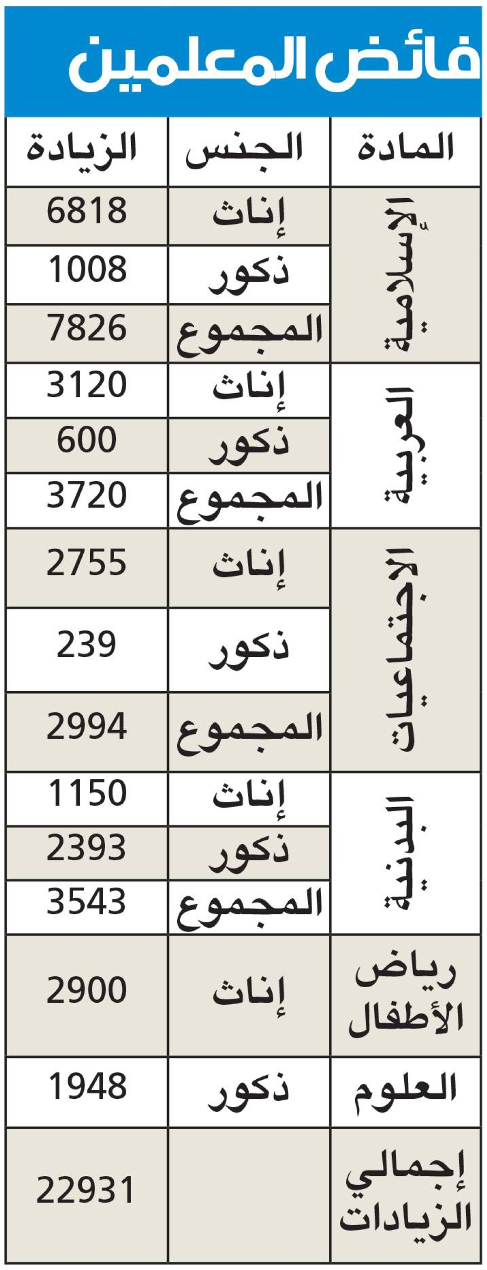 وقالت المصادر إن عدد المعلمات الفائضات عن الحاجة في تخصص مادة التربية الإسلامية بلغ 6818 معلمة، إضافة إلى 1008 معلمين في نفس التخصص بإجمالي بلغ 7826، مشيرة إلى أن عدد المعلمات الفائضات في مادة اللغة العربية بلغ 3120 معلمة، إضافة إلى 600 معلم في نفس التخصص بإجمالي بلغ 3720.