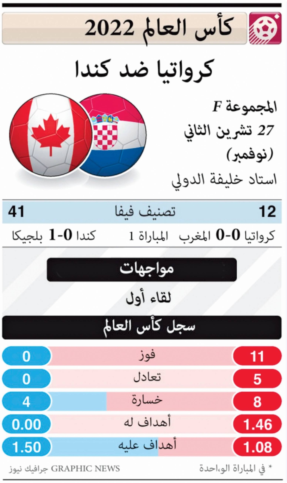 ويلعب المنتخب الكرواتي مع نظيره الكندي اليوم، في الجولة الثانية لمباريات المجموعة السادسة من مرحلة المجموعات للمونديال، على ملعب خليفة الدولي. واستهل منتخب كرواتيا مسيرته في المجموعة بالتعادل من دون أهداف مع نظيره المغربي يوم الأربعاء الماضي، ليتقاسم المركز الثاني في ترتيب المجموعة مع منتخب «أسود الأطلس» برصيد نقطة واحدة، بفارق نقطتين خلف منتخب بلجيكا، الذي تغلّب 1 - صفر بصعوبة بالغة، على منتخب كندا، متذيل الترتيب بلا نقاط.