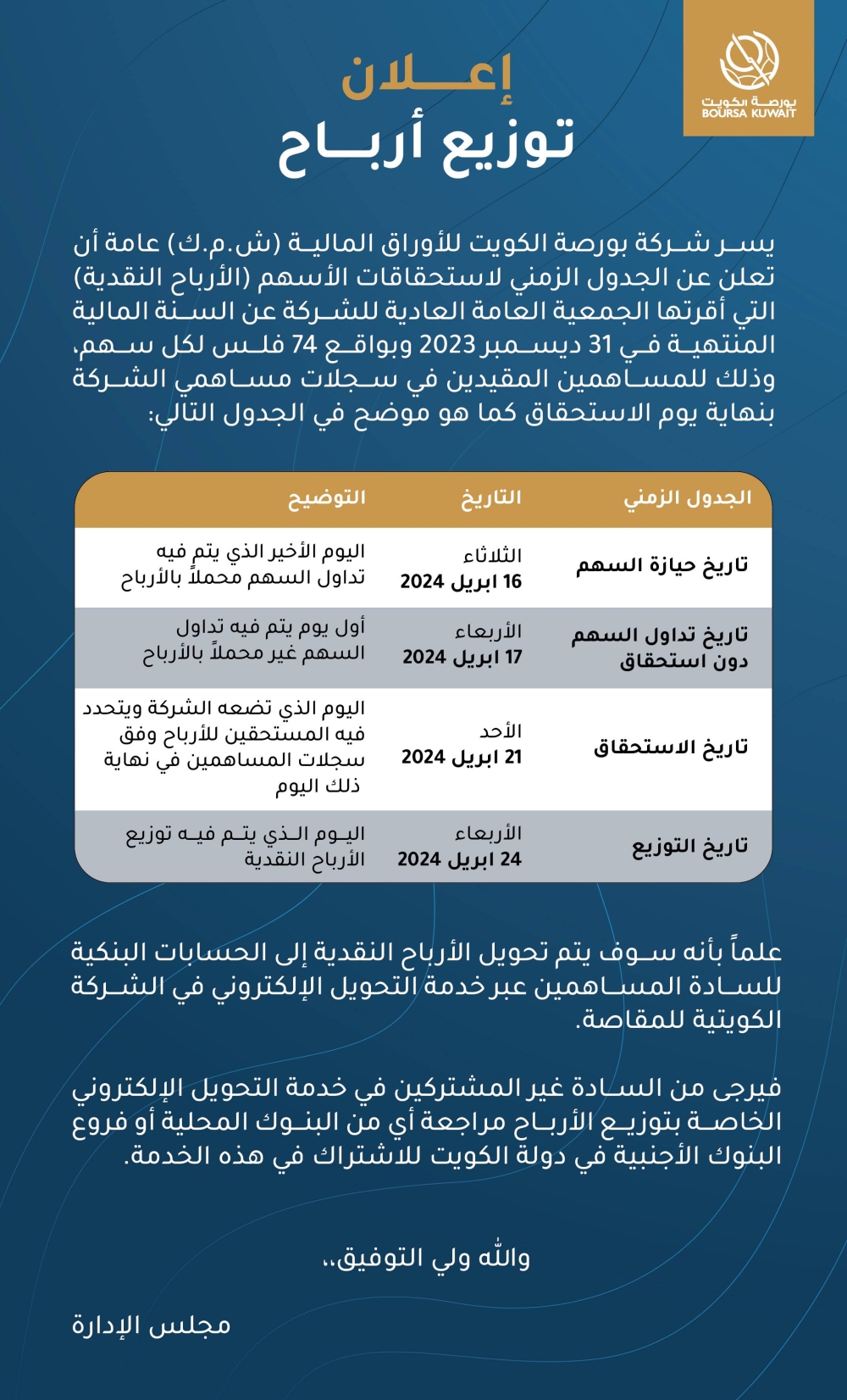 وعملت بورصة الكويت منذ تأسيسها على إنشاء بورصة موثوقة مبنية على المصداقية والشفافية، وخلق سوق مالي مرن يتمتع بالسيولة، ومنصة تداول متقدمة، إضافة إلى تطوير مجموعة شاملة من الإصلاحات والتحسينات التي جعلتها ترتقي إلى أعلى المستويات الإقليمية والدولية.الأرباح تستحق للمساهمين المقيدين في سجلات الشركة بنهاية يوم الاستحقاق في 21 أبريل المقبل