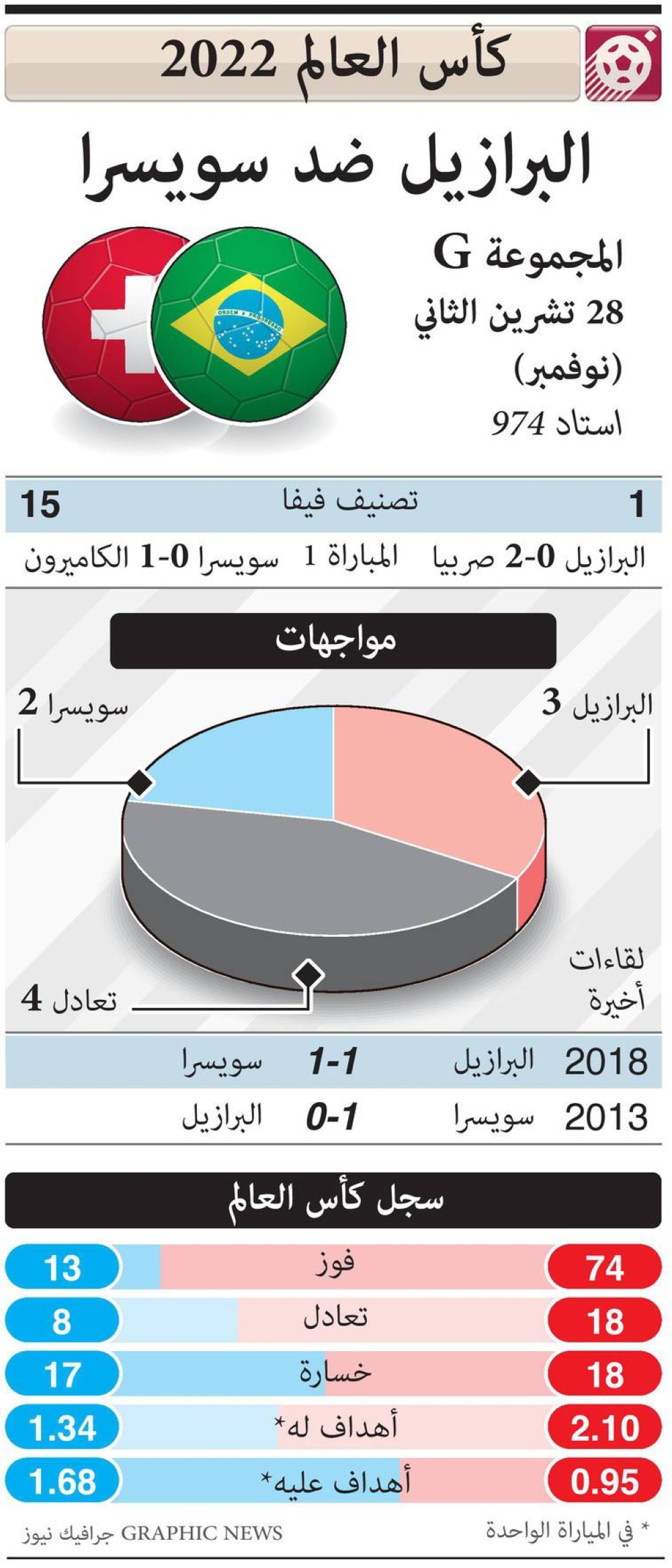 ويلعب المنتخب البرازيلي، صاحب الرقم القياسي في عدد مرات الفوز بكأس العالم برصيد 5 ألقاب، مع منتخب سويسرا، على ملعب (974)، ضمن منافسات الجولة الثانية لمباريات المجموعة السابعة من مرحلة المجموعات في المونديال القطري.