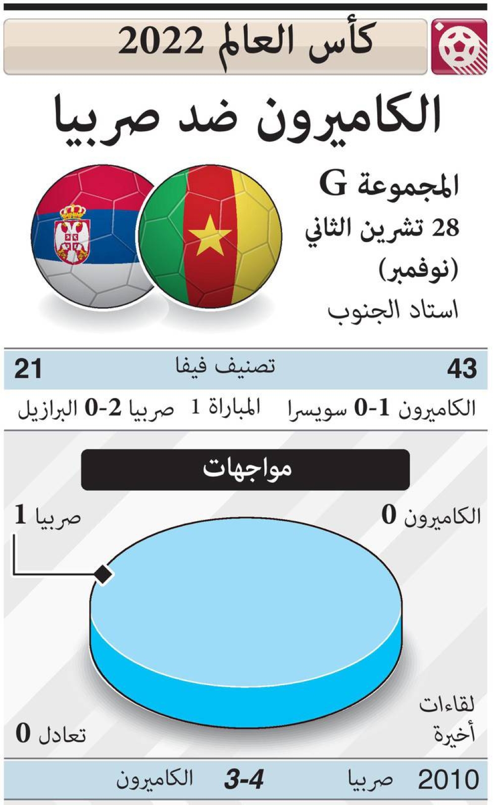 بعدما خسرا مواجهتهما الأولى في نهائيات كأس العالم لكرة القدم، المقامة حاليا في قطر، يخوض منتخبا الكاميرون وصربيا لقاء الفرصة الأخيرة عندما يلتقيان اليوم، أملا في استكمال مشوارهما بالمونديال.