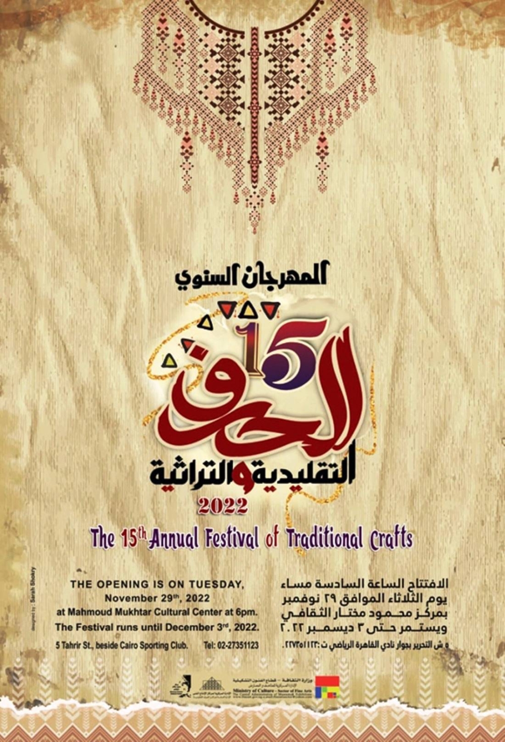تنطلق فعاليات الدورة الـ 15 من المهرجان السنوي للحرف التقليدية والتراثية بمركز محمود مختار الثقافي في القاهرة، اليوم، بحضور نيفين الكيلاني وزيرة الثقافة المصرية، وخالد سرور رئيس قطاع الفنون التشكيلية.
