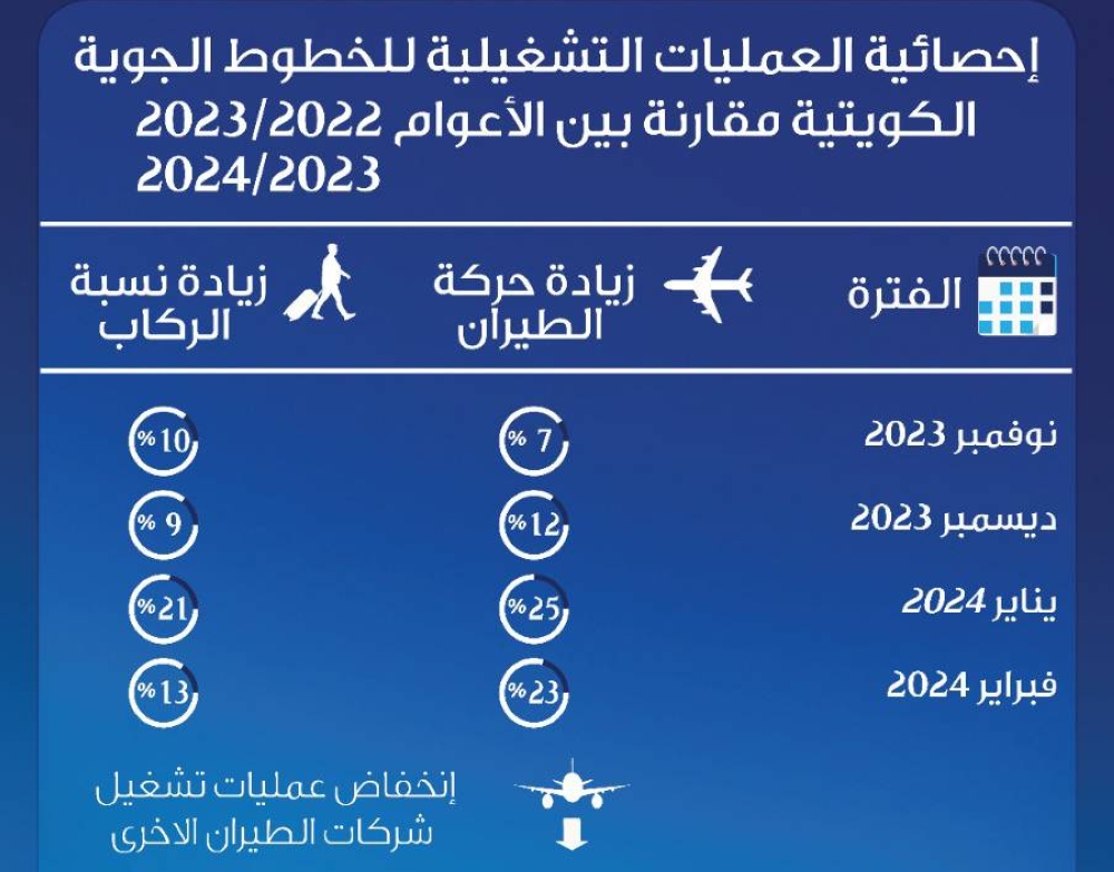 أعلنت شركة الخطوط الجوية الكويتية نتائج التشغيل لحركة الطائرات والركاب في نوفمبر وديسمبر 2023، ويناير وفبراير 2024، وأظهرت النتائج الصادرة عن الإدارة العامة للطيران المدني ارتفاع حركة الطائرات بنسبة%7، وحركة الركاب بنسبة%10 في نوفمبر 2023، مقارنة بنفس الفترة من عام 2022، كما ارتفعت حركة الطائرات بنسبة%12، وحركة الركاب بنسبة%9 في ديسمبر 2023 عن نفس الفترة من عام 2022.