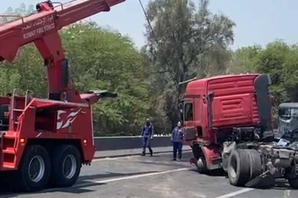 وفي تفاصيل الحادث الأول، ذكرت إدارة العلاقات العامة والإعلام في قوة الإطفاء العام أن غرفة عمليات قوة الإطفاء العام تلقت بلاغا صباح اليوم يفيد بوقوع حادث تصادم ثلاثي بين حافلة نقل عام كان على متنها 10 ركاب من جنسيات مختلفة وشاحنة بقيادة وافد آسيوي، ومركبة بقيادة وافد عربي على طريق المطار، وأن هناك أشخاصا محشورين جراء الحادث.