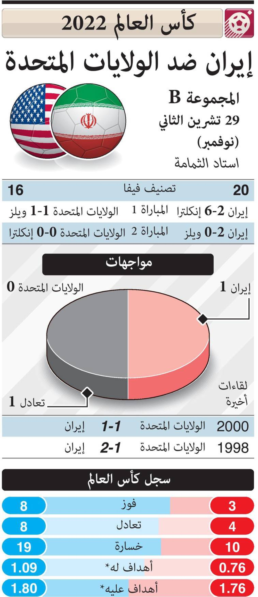 وتعيد مباراة إيران وأميركا إلى الأذهان لقاءهما الشهير في دور المجموعات بمونديال فرنسا عام 1998، والذي انتهى بفوز المنتخب الإيراني 2/ 1، مدونا انتصاره الأول في تاريخه بكأس العالم آنذاك.