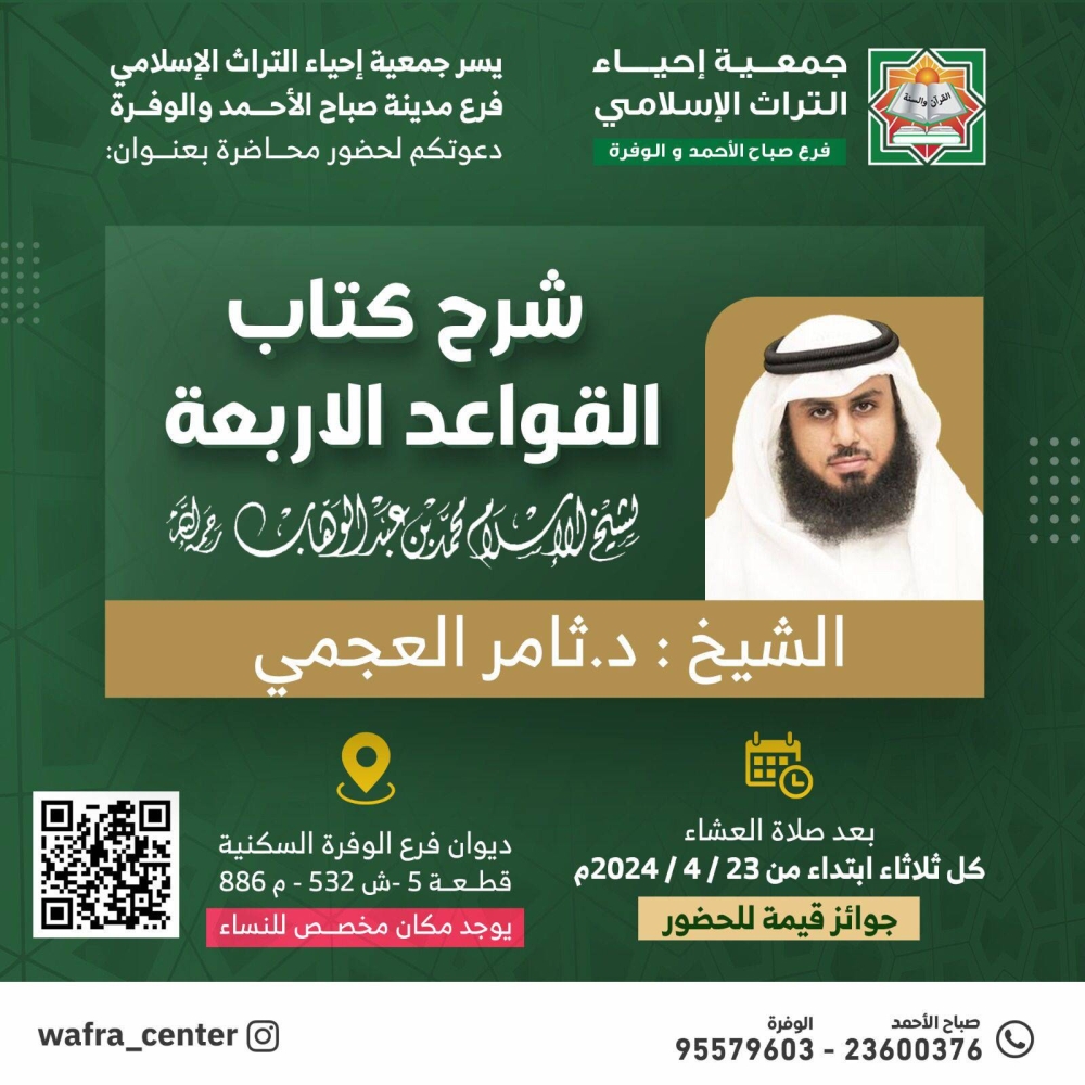 وأشارت الجمعية، في بيان، اليوم ، إلى تنظيم محاضرة أسبوعية في شرح كتاب «القواعد الأربعة لشيخ الإسلام محمد بن عبدالوهاب»، يلقيها الشيخ د. ثامر العجمي كل يوم ثلاثاء بعد صلاة العشاء، في ديوان فرع الجمعية بمنطقة الوفرة السكنية، وذلك ابتداء من الغد.