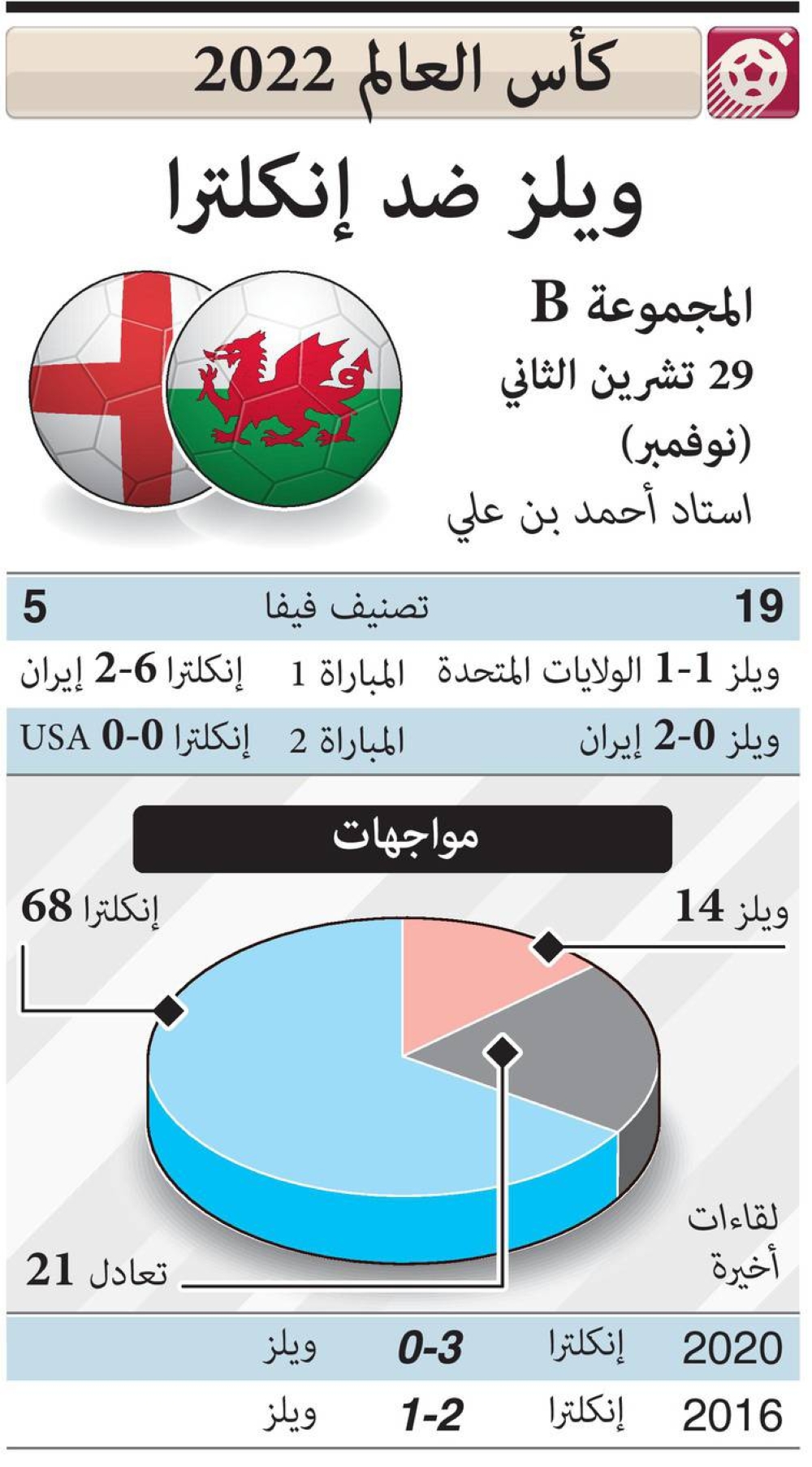 ويمتلك المنتخب الإنكليزي، الساعي للفوز باللقب للمرة الثانية في تاريخه بعدما توج بها عام 1966 حينما استضاف المونديال على ملاعبه، الحظوظ الأوفر في الصعود للدور المقبل، حيث يكفيه التعادل مع ويلز للصعود رسميا، دون النظر لنتيجة مباراة أميركا وإيران.