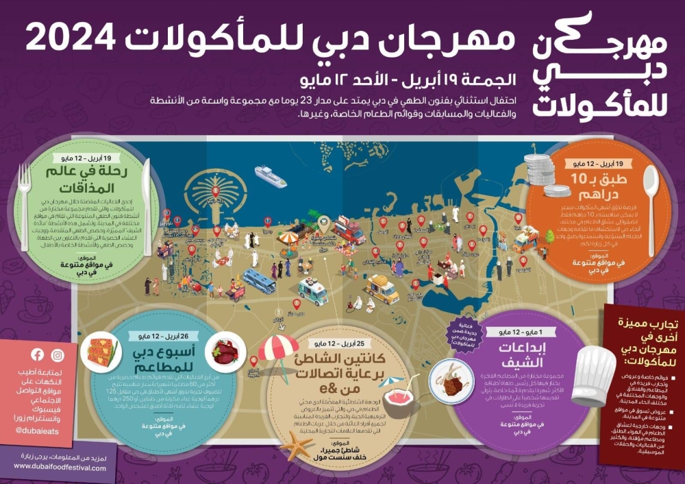 ويُمكن خلال هذا الأسبوع الاستمتاع بعدد من فعاليات المهرجان المميزة ومن ضمنها، «طبق بـ 10 دراهم»، حيث انطلقت الدورة الجديدة من هذه الفعالية المميزة بالتعاون مع عدد كبير من المطاعم في جميع أنحاء المدينة، حيث يُمكن للجميع تذوّق أشهى الأطباق المميزة مقابل 10 دراهم فقط.