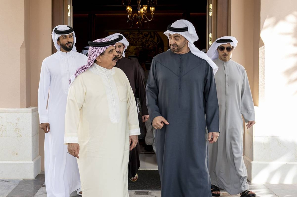 استقبل الرئيس الإماراتي، الشيخ محمد بن زايد، في أبوظبي اليوم، ملك البحرين حمد بن عيسى، ودعوَا إلى تهدئة الأوضاع في منطقة الشرق الأوسط وتجنّب التصعيد العسكري وتغليب الحلول الدبلوماسية وتسوية النزاعات كافة بالحوار والتفاوض.
