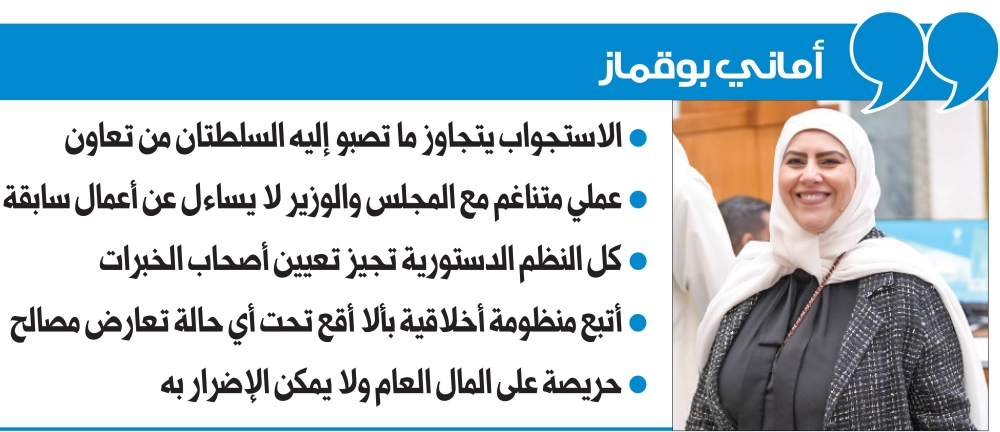 واستأنف الرئيس السعدون الجلسة، وبدأت الوزيرة أماني بوقماز مرافعتها الأولى لتفنيد محاور الاستجواب، وقالت في بداية حديثها: أؤكد على التعاون التام مع المجلس والنواب وعملي متناغم مع المجلس والوزير لا يساءل عن أعمال سابقة ومن المؤسف أن الاستجواب اليوم يتهمني بأني كذبت وضللت النواب وهذا غير مقبول والاستجواب يتجاوز ماتصبو إليه السلطتان وهو التعاون والإصلاح.