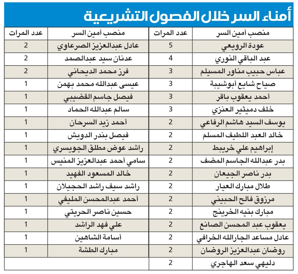 تقلد 34 نائباً منصب أمين السر في مجلس الأمة على مدار تاريخ الحياة النيابية بدءاً من يوسف الرفاعي أول من تولى هذا المنصب، إلى مبارك الطشة آخر من تولاه. وجاء النائب السابق د. عودة الرويعي في صدارة من تولوا المنصب، حيث فاز به في 5 أدوار انعقاد، يليه النائب عبدالباقي النوري بـ 4 أدوار، كما تولى المنصب في 3 أدوار 4 نواب هم عباس مناور، وصياح أبوشيبة، وأحمد باقر، وخلف دميثير العنزي، وتولى المنصب مرتين 14 نائباً، و13 نائباً مرة واحدة. ومنذ مجلس 1963، فاز بالمنصب 34 نائباً، وكان عدد مرات الفوز بالتزكية 18 مرة مقابل 45 مرة بالانتخاب ومرة واحدة بالقرعة.