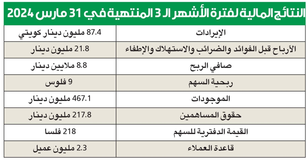 النتائج المالية لفترة الأشهر الـ 3 المنتهية في 31 مارس 2024الإيرادات 87.4 مليون دينار كويتيالأرباح قبل الفوائد والضرائب والاستهلاك والإطفاء21.8 مليون دينار صافي الربح 8.8 ملايين دينارربحية السهم 9 فلوس الموجودات467.1 مليون دينار حقوق المساهمين217.8 مليون دينار القيمة الدفترية للسهم218 فلسا قاعدة العملاء2.3 مليون عميل