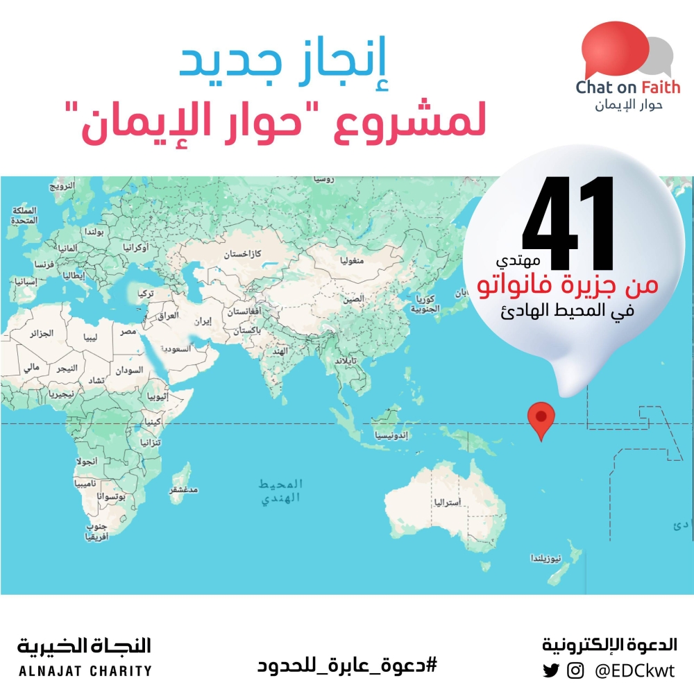 أعلنت مديرة لجنة الدعوة الإلكترونية التابعة لجمعية النجاة الخيرية، إيمان العلي، آخر إنجازات مشروع «حوار الإيمان» التابع للجنة، والمتمثل في إشهار إسلام 41 مهتديا جديدا من جزيرة فانواتو التي تقع في جنوب المحيط الهادئ على بعد 1750 كم تقريباً شمال شرق أستراليا، ويتحدث أهلها اللغة الإنكليزية.