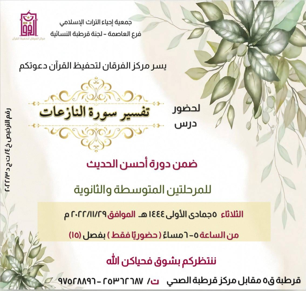وقالت الجمعية، في بيان، أمس، إن القطاع النسائي نظم العديد من الأنشطة والفعاليات الثقافية، منها درس في تفسير سورة النازعات، والذي يشرف عليه مركز الفرقان لتحفيظ القرآن في لجنة قرطبة النسائية، ضمن دورة أحسن الحديث لطالبات المرحلتين المتوسطة والثانوية.