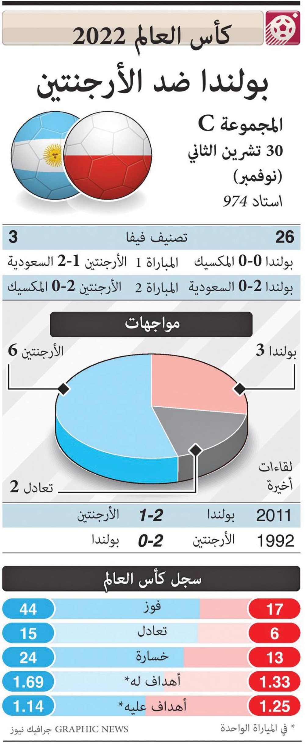 من هنا تبرز أهمية الفوز بالنسبة للأرجنتين التي تصطدم بليفاندوفسكي ورفاقه، وهي المواجهة الثالثة بين «ألبيسيليستي» و«النسور البيضاء» في تاريخ المونديال، وكانت الأولى في 1974 وفازت بها بولندا، قبل أن ترد الأرجنتين في نسخة 1978 وتهزم الفريق الأوروبي، وهي البطولة التي توج بها المنتخب اللاتيني.