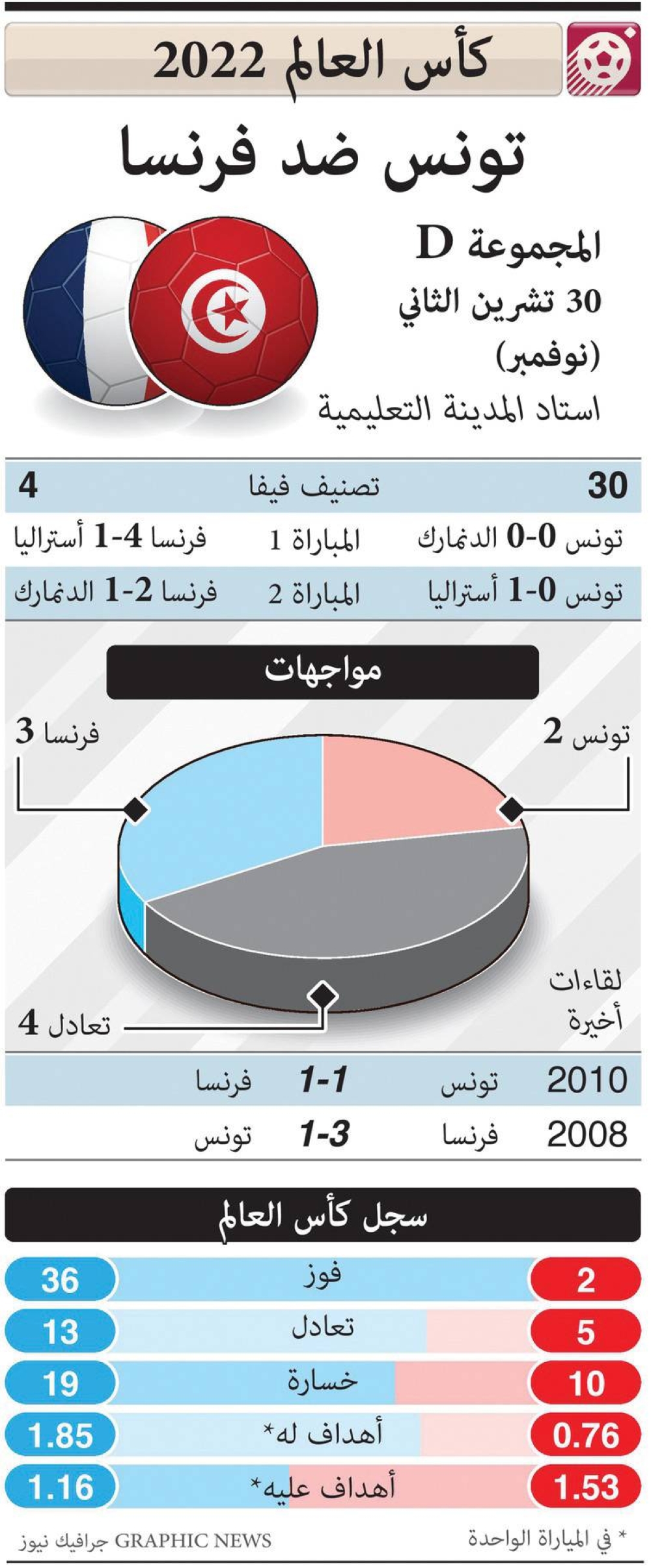 من ناحيتها، تخوض فرنسا المباراة من دون ضغوطات بعدما فازت على أستراليا 4-1 وأتبعته بثانٍ على الدنمارك 2-1، لتتربع على الصدارة بالعلامة الكاملة (6) على أمل تعزيزها بفوز ثالث.