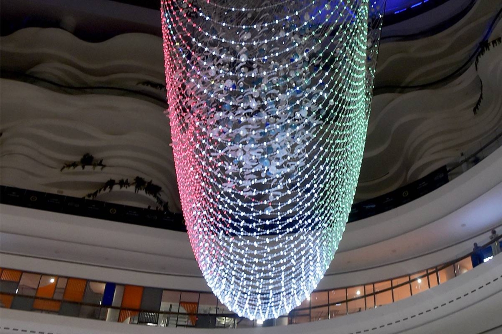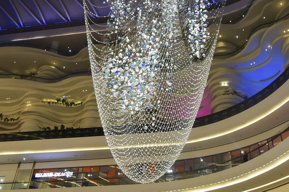 ويمكن لكل زوار مول العاصمة أن يتمتعوا بجمال لآلئ العاصمة منسدلة من سقف البهو الرئيسي، كما يمكنهم الاطلاع على مزيد من التفاصيل حول حقائق الثريا في شاشة العرض الموضوعة أمامها، وهي مقصد جميع الزوار الآن.