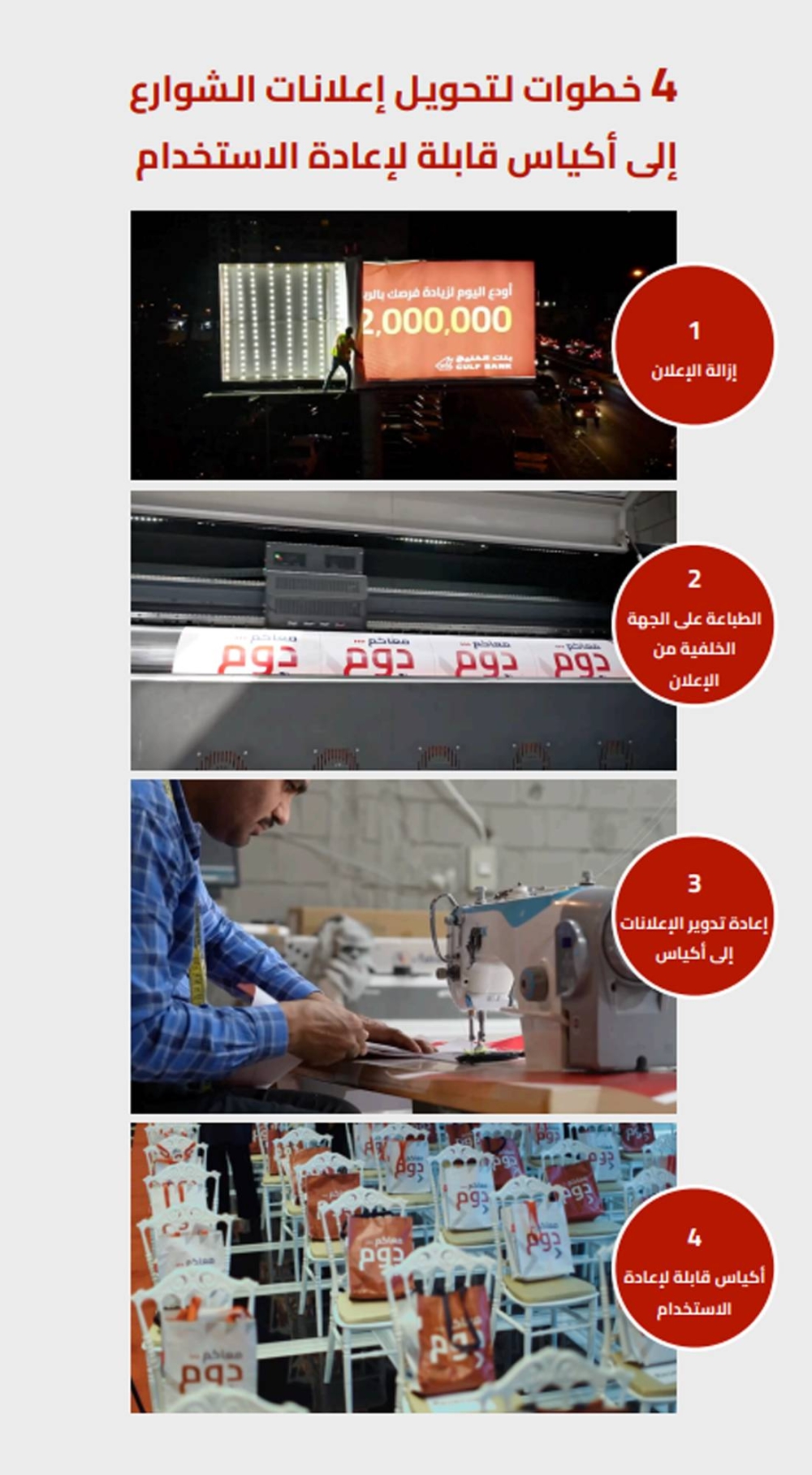 وأشارت العيسى إلى أن عملية إعادة التدوير تتم من خلال عدة خطوات، تستهدف تقليص المواد الخام للإعلانات بعد إزالتها، حيث يتم تسليم تلك الإعلانات إلى شركة متخصصة في إعادة التدوير، والتي بدورها تقوم بتنظيفها وتعقيمها، ومن ثم تصميم وتقطيع المقاسات، لتتم إعادة تدوير الكيس في شكل جذاب وقابل لإعادة الاستخدام عدة مرات.