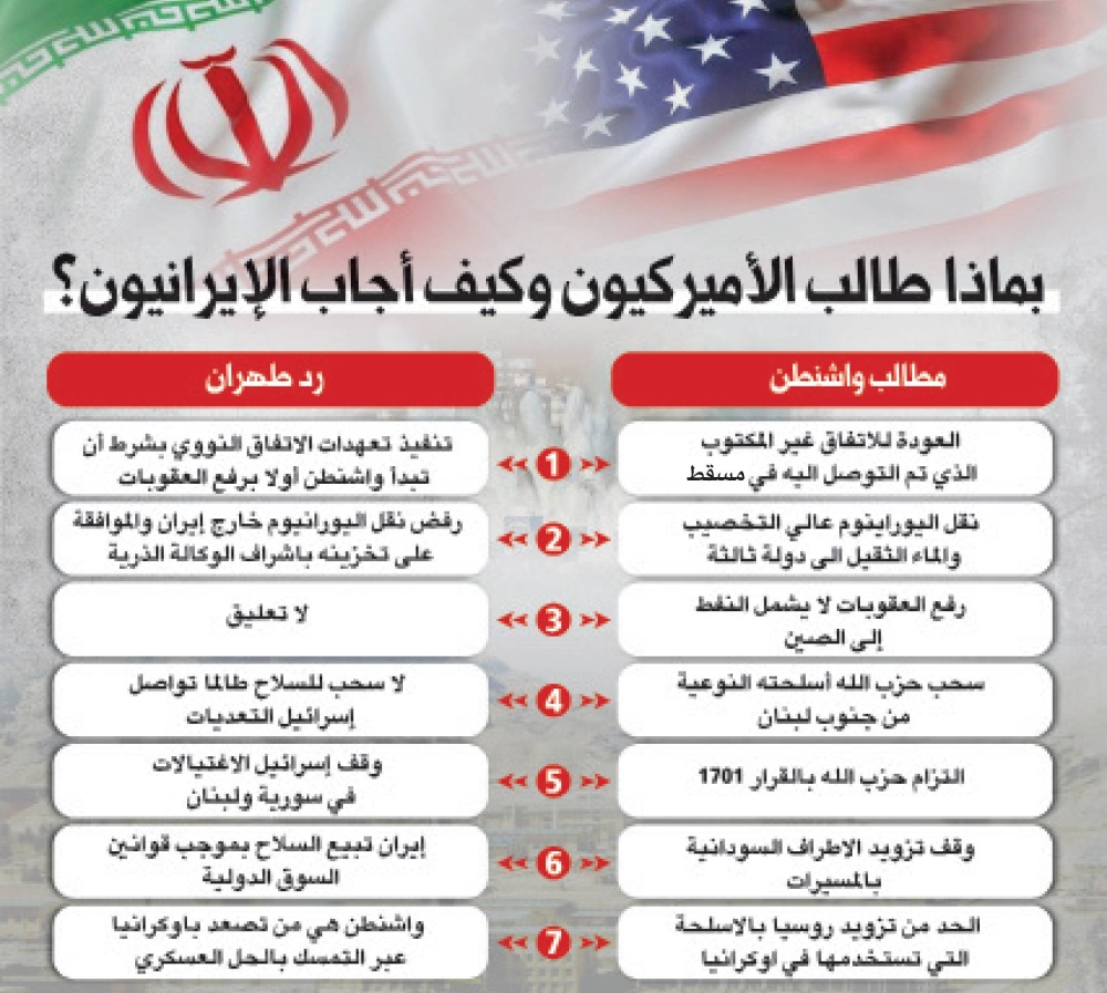 وعن الملف الأول، كشف المصدر أن الجانب الإيراني أكد استعداده لتنفيذ تعهداته في الاتفاق النووي والالتزام بتخصيب اليورانيوم بنسبة 3.67 في المئة، والالتزام بسقف إنتاج الماء الثقيل واليورانيوم، شريطة أن تقوم الولايات المتحدة أولاً برفع العقوبات عن إيران، وفقاً للجدول المنصوص عليه في اتفاق 2015، موضحاً أن الإيرانيين أبدوا استعدادهم أيضاً للعودة إلى مفاوضات مسقط، ونصحوا واشنطن بالعودة إلى الاتفاق وتقديم ضمانات من بينها التعهد بعدم محاولة تفعيل «بند الزناد» الذي يسمح نظرياً بعدة عقوبات أممية على طهران.