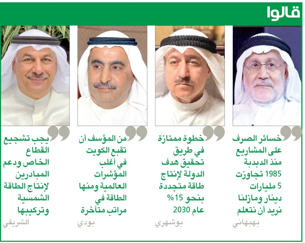 وذكر بهبهاني أن «هناك من احتج على تحليلاتنا السابقة حول فشل هذا النوع من المشاريع، بتطور التكنولوجيا بما يناسب الظروف المناخية للكويت، ومما لا شك فيه أن الطاقة الشمسية، في الظروف المعتدلة، مصدر مقبول باستعمالات السيليكون بانل (الواح) الاعتيادية».
